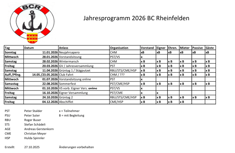 Auf dieser Seite werden die Anlässe und allfällige Änderungen des Jahresprogrammes jeweils bekanntgegeben.