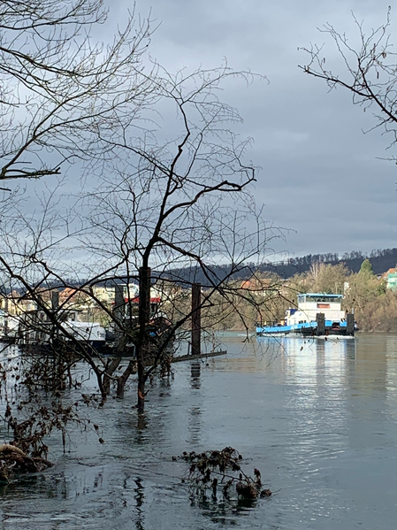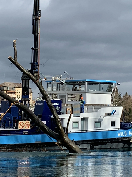 Die abgestürzte unter Wasser liegende sperrig Buche lässt sich zwar wegziehen, trotzt aber plötzlich mitten im Fluss und wehrt sich vor der endgültigen Zerstückelung. Nicht ein Kurzeinsatz von 2 Stunden, wie angedacht, sondern ein langer Arbeitstag wird nötig, um den Teilerfolg freie Ausfahrt von der BCR Steginnenseite zu vermelden. Mit einer Starkregen-Phase Ende Januar 2021 und den im Voraus bereits erodierten Hanglage oberhalb unseres Bootssteges, stürzte ein veritabler Baum ab und versperrte die Ausfahrt von den Steg-Innenliegeplätze.