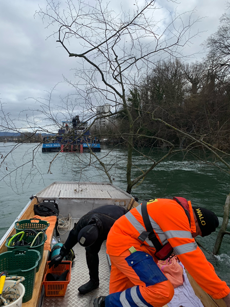 Da das teure Kevlar-Schleppseil unter Wasser nicht gelöst werden konnten, musste die 300 Meter Seil an Land gebracht werden und so der Stamm und das Schleppseil gesichert werden. Nächste Lösungsansätze sind Luftkissen und grössere Krankapazitäten einzusetzen, aber vorerst ruht der sperrige Stamm im Rhein, bis die Sicht klar wird und die Strömung deutlich schwächer, damit ein Arbeitstaucher sicher eingesetzt werden kann.