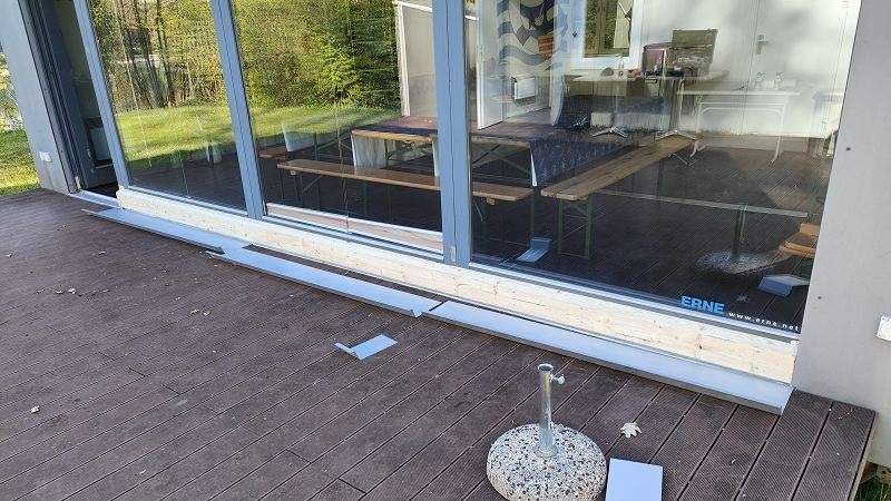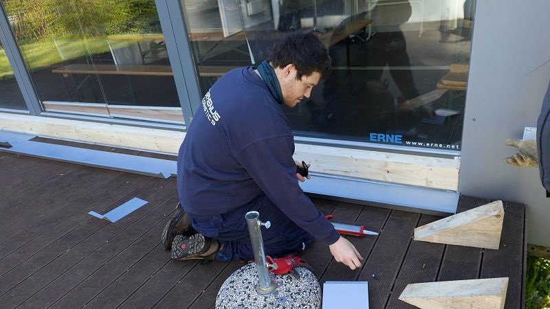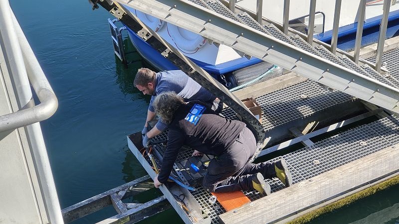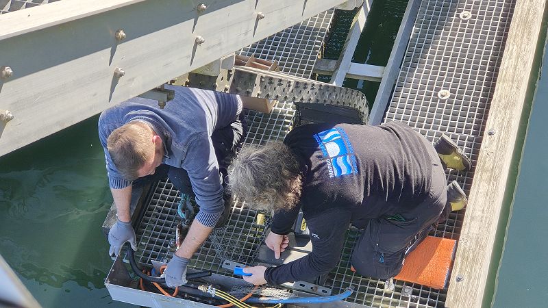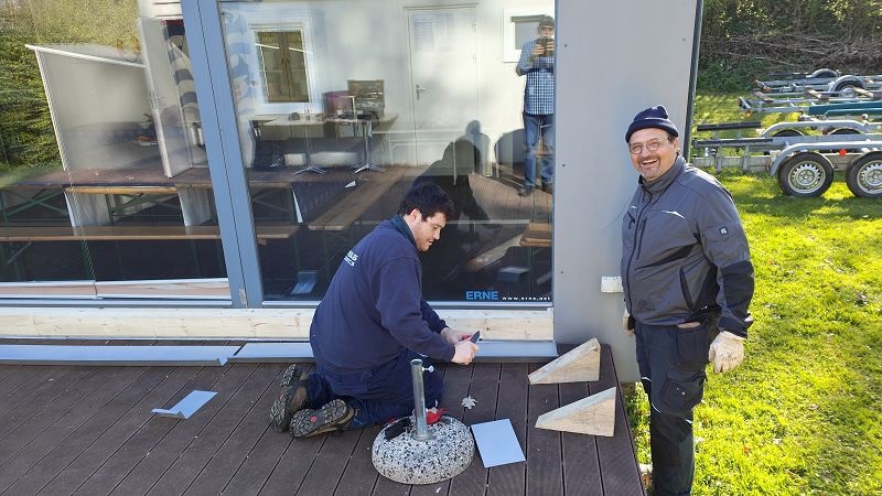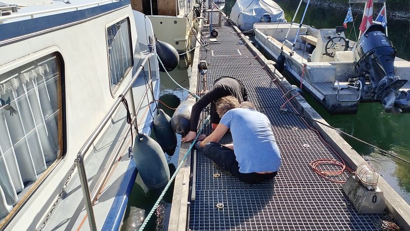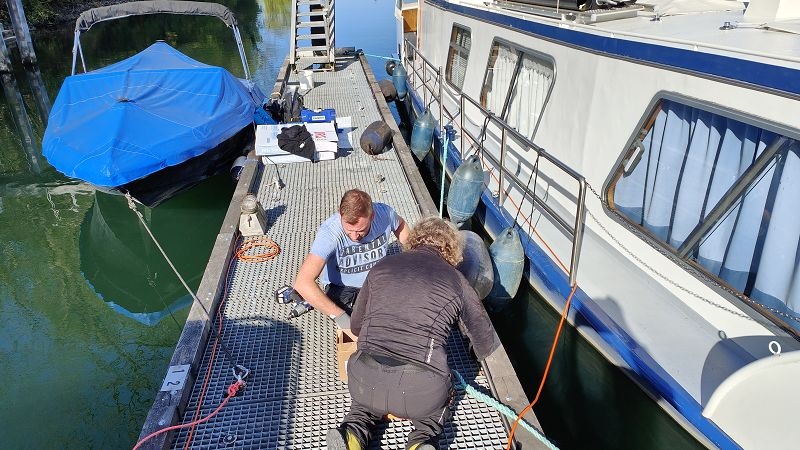 Auf dem Steg musste die Trinkwasserleitung ersetzt werden. Dies gestaltet sich gar nicht so einfach, weshalb Marco und Marc eine provisorische Leitung auf dem Steg verlegt haben.